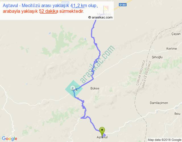 Aştavul - Mecitözü arası yaklaşık olarak 90 km/h ile yukarıda belirtilen sürede olup, iki yerin kuş uçuşu uzaklığı (mesafesi) 25'dir. Yolculuk otobüsle 1 saat 7 dakika sürmektedir.
