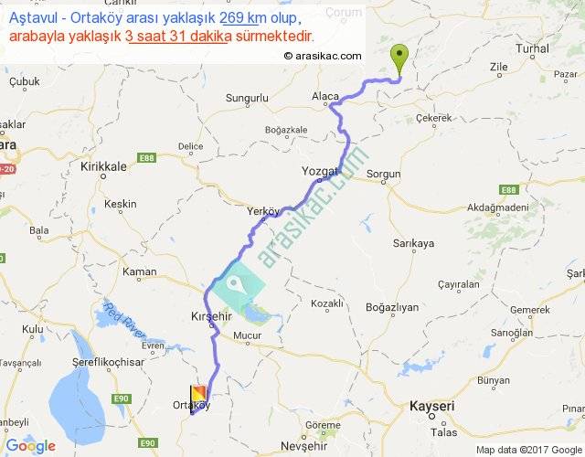 Aştavul - Ortaköy arası yaklaşık olarak 90 km/h ile yukarıda belirtilen sürede olup, iki yerin kuş uçuşu uzaklığı (mesafesi) 203'dir. Yolculuk otobüsle 4 saat 34 dakika sürmektedir.