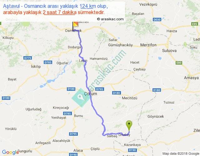 Aştavul - Osmancık arası yaklaşık olarak 90 km/h ile yukarıda belirtilen sürede olup, iki yerin kuş uçuşu uzaklığı (mesafesi) 85'dir. Yolculuk otobüsle 2 saat 45 dakika sürmektedir.