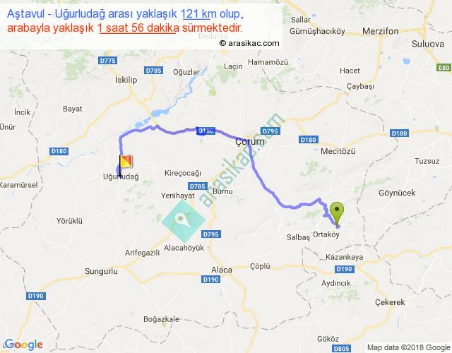 Aştavul - Uğurludağ arası yaklaşık olarak 90 km/h ile yukarıda belirtilen sürede olup, iki yerin kuş uçuşu uzaklığı (mesafesi) 73'dir. Yolculuk otobüsle 2 saat 30 dakika sürmektedir.