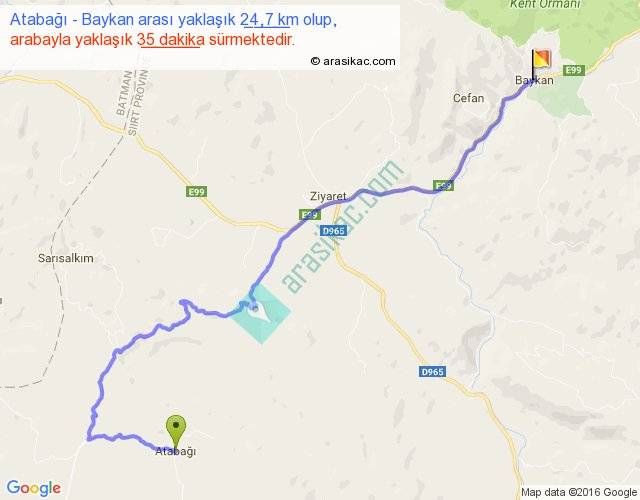 Atabağı - Baykan arası yaklaşık olarak 90 km/h ile yukarıda belirtilen sürede olup, iki yerin kuş uçuşu uzaklığı (mesafesi) 15'dir. Yolculuk otobüsle 45 dakika sürmektedir.
