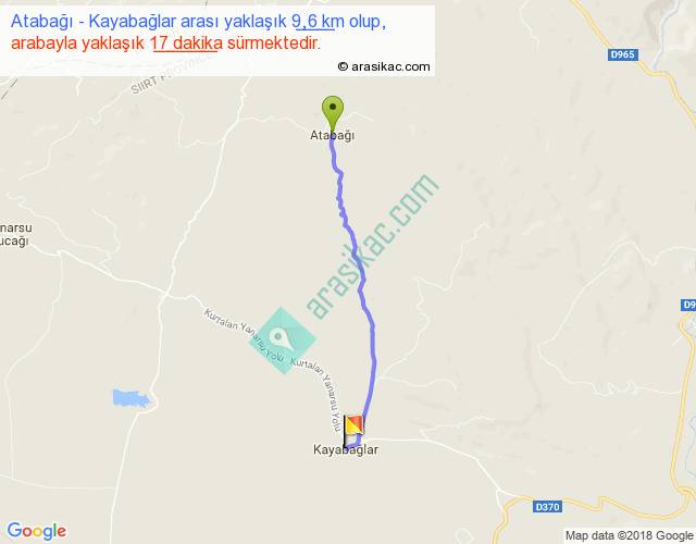 Atabağı - Kayabağlar arası yaklaşık olarak 90 km/h ile yukarıda belirtilen sürede olup, iki yerin kuş uçuşu uzaklığı (mesafesi) 9'dir. Yolculuk otobüsle 22 dakika sürmektedir.