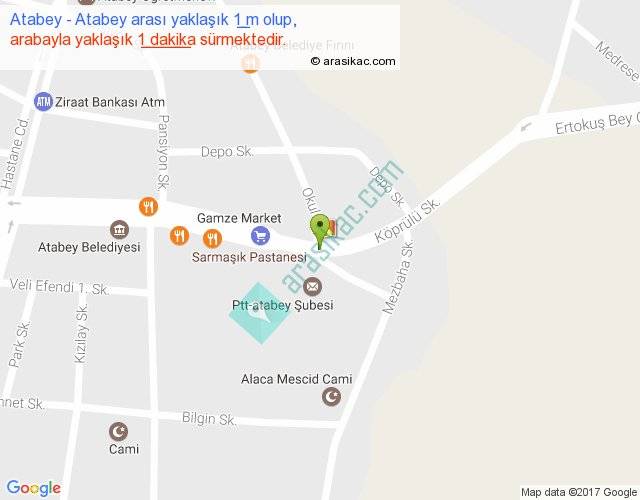 Atabey - Atabey arası yaklaşık olarak 90 km/h ile yukarıda belirtilen sürede olup, iki yerin kuş uçuşu uzaklığı (mesafesi) 0'dir. Yolculuk otobüsle 1 dakika sürmektedir.
