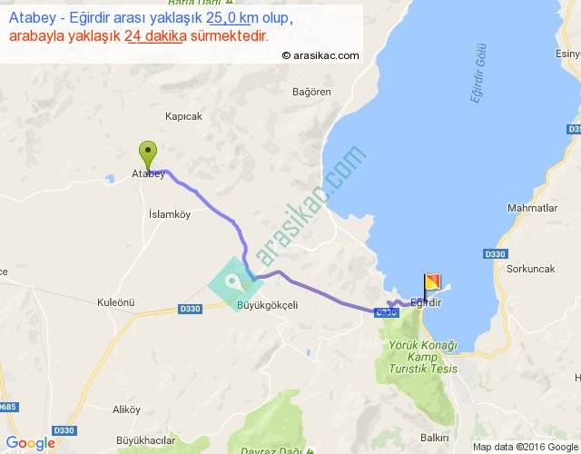 Atabey - Eğirdir arası yaklaşık olarak 90 km/h ile yukarıda belirtilen sürede olup, iki yerin kuş uçuşu uzaklığı (mesafesi) 20'dir. Yolculuk otobüsle 31 dakika sürmektedir.