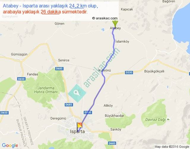 Atabey - Isparta arası yaklaşık olarak 90 km/h ile yukarıda belirtilen sürede olup, iki yerin kuş uçuşu uzaklığı (mesafesi) 22'dir. Yolculuk otobüsle 33 dakika sürmektedir.