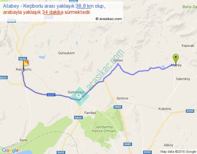 Atabey - Keçiborlu arası yaklaşık olarak 90 km/h ile yukarıda belirtilen sürede olup, iki yerin kuş uçuşu uzaklığı (mesafesi) 30'dir. Yolculuk otobüsle 44 dakika sürmektedir.