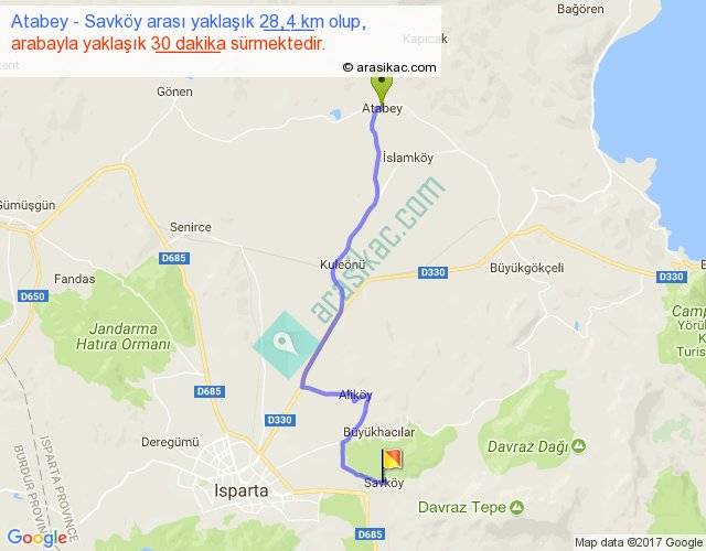 Atabey - Savköy arası yaklaşık olarak 90 km/h ile yukarıda belirtilen sürede olup, iki yerin kuş uçuşu uzaklığı (mesafesi) 20'dir. Yolculuk otobüsle 39 dakika sürmektedir.