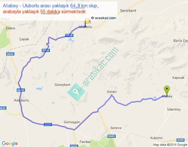 Atabey - Uluborlu arası yaklaşık olarak 90 km/h ile yukarıda belirtilen sürede olup, iki yerin kuş uçuşu uzaklığı (mesafesi) 22'dir. Yolculuk otobüsle 1 saat 11 dakika sürmektedir.