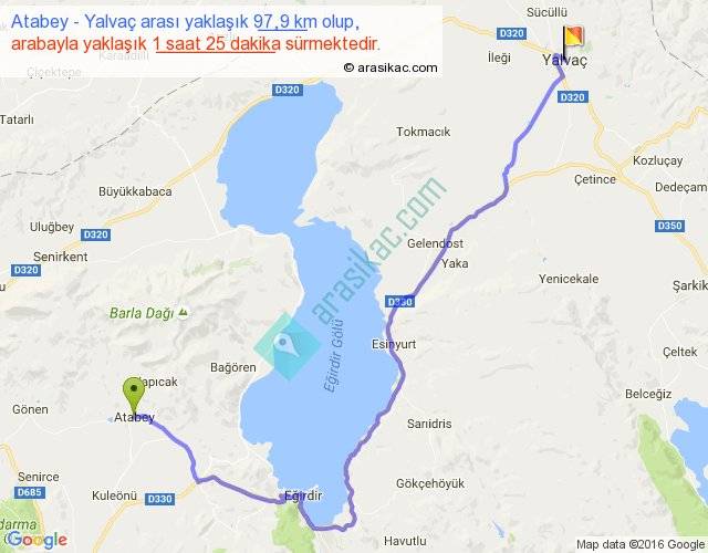 Atabey - Yalvaç arası yaklaşık olarak 90 km/h ile yukarıda belirtilen sürede olup, iki yerin kuş uçuşu uzaklığı (mesafesi) 60'dir. Yolculuk otobüsle 1 saat 50 dakika sürmektedir.