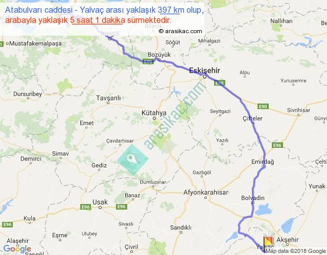 Atabulvarı caddesi - Yalvaç arası yaklaşık olarak 90 km/h ile yukarıda belirtilen sürede olup, iki yerin kuş uçuşu uzaklığı (mesafesi) 285'dir. Eğer belirtilen yerler arasında uçak seferi var ise bu süre uçakla 26 dakika'ya kadar düşebilir. Yolculuk otobüsle 6 saat 31 dakika sürmektedir.