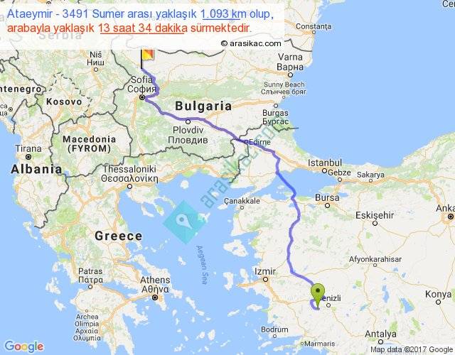 Ataeymir - 3491 Sumer arası yaklaşık olarak 90 km/h ile yukarıda belirtilen sürede olup, iki yerin kuş uçuşu uzaklığı (mesafesi) 771'dir. Eğer belirtilen yerler arasında uçak seferi var ise bu süre uçakla 1 saat 11 dakika'ya kadar düşebilir. Yolculuk otobüsle 17 saat 38 dakika sürmektedir.