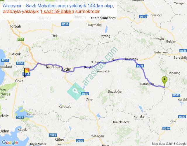 Ataeymir - Sazlı Mahallesi arası yaklaşık olarak 90 km/h ile yukarıda belirtilen sürede olup, iki yerin kuş uçuşu uzaklığı (mesafesi) 115'dir. Yolculuk otobüsle 2 saat 34 dakika sürmektedir.