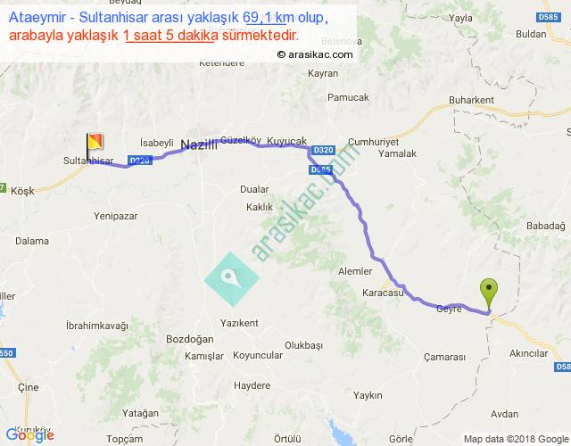 Ataeymir - Sultanhisar arası yaklaşık olarak 90 km/h ile yukarıda belirtilen sürede olup, iki yerin kuş uçuşu uzaklığı (mesafesi) 57'dir. Yolculuk otobüsle 1 saat 24 dakika sürmektedir.