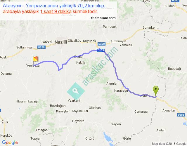 Ataeymir - Yenipazar arası yaklaşık olarak 90 km/h ile yukarıda belirtilen sürede olup, iki yerin kuş uçuşu uzaklığı (mesafesi) 52'dir. Yolculuk otobüsle 1 saat 29 dakika sürmektedir.