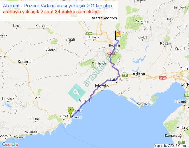 Atakent - Pozantı Adana arası yaklaşık olarak 90 km/h ile yukarıda belirtilen sürede olup, iki yerin kuş uçuşu uzaklığı (mesafesi) 147'dir. Yolculuk otobüsle 3 saat 20 dakika sürmektedir.