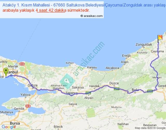 Ataköy 1. Kısım Mahallesi - 67660 Saltukova Belediyesi Çaycuma Zonguldak arası yaklaşık olarak 90 km/h ile yukarıda belirtilen sürede olup, iki yerin kuş uçuşu uzaklığı (mesafesi) 275'dir. Eğer belirtilen yerler arasında uçak seferi var ise bu süre uçakla 25 dakika'ya kadar düşebilir. Yolculuk otobüsle 6 saat 6 dakika sürmektedir.