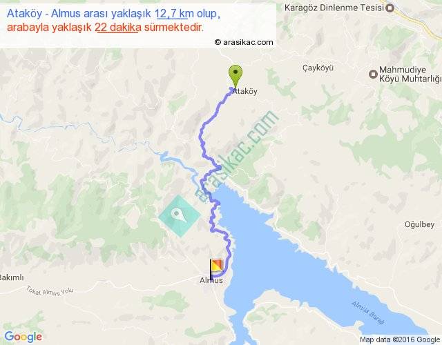 Ataköy - Almus arası yaklaşık olarak 90 km/h ile yukarıda belirtilen sürede olup, iki yerin kuş uçuşu uzaklığı (mesafesi) 8'dir. Yolculuk otobüsle 28 dakika sürmektedir.