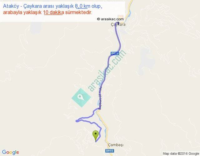 Ataköy - Çaykara arası yaklaşık olarak 90 km/h ile yukarıda belirtilen sürede olup, iki yerin kuş uçuşu uzaklığı (mesafesi) 6'dir. Yolculuk otobüsle 13 dakika sürmektedir.