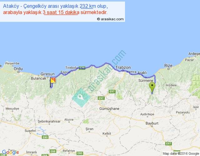 Ataköy - Çengelköy arası yaklaşık olarak 90 km/h ile yukarıda belirtilen sürede olup, iki yerin kuş uçuşu uzaklığı (mesafesi) 150'dir. Yolculuk otobüsle 4 saat 13 dakika sürmektedir.