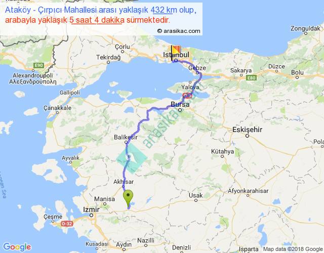Ataköy - Çırpıcı Mahallesi arası yaklaşık olarak 90 km/h ile yukarıda belirtilen sürede olup, iki yerin kuş uçuşu uzaklığı (mesafesi) 283'dir. Eğer belirtilen yerler arasında uçak seferi var ise bu süre uçakla 26 dakika'ya kadar düşebilir. Yolculuk otobüsle 6 saat 35 dakika sürmektedir.