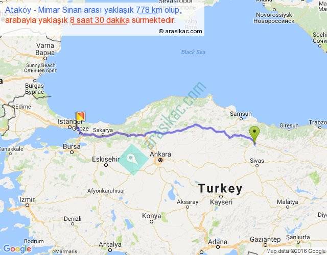 Ataköy - Mimar Sinan arası yaklaşık olarak 90 km/h ile yukarıda belirtilen sürede olup, iki yerin kuş uçuşu uzaklığı (mesafesi) 644'dir. Eğer belirtilen yerler arasında uçak seferi var ise bu süre uçakla 59 dakika'ya kadar düşebilir. Yolculuk otobüsle 11 saat 3 dakika sürmektedir.