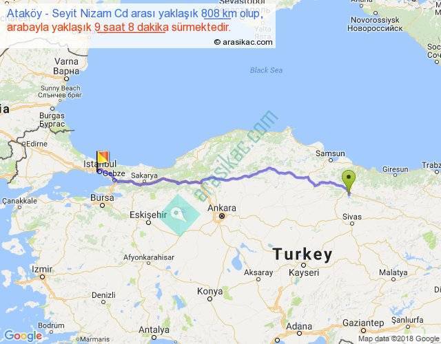 Ataköy - Seyit Nizam Cd arası yaklaşık olarak 90 km/h ile yukarıda belirtilen sürede olup, iki yerin kuş uçuşu uzaklığı (mesafesi) 674'dir. Eğer belirtilen yerler arasında uçak seferi var ise bu süre uçakla 1 saat 02 dakika'ya kadar düşebilir. Yolculuk otobüsle 11 saat 52 dakika sürmektedir.