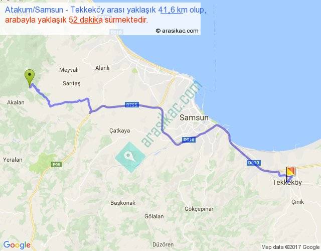 Atakum Samsun - Tekkeköy arası yaklaşık olarak 90 km/h ile yukarıda belirtilen sürede olup, iki yerin kuş uçuşu uzaklığı (mesafesi) 31'dir. Yolculuk otobüsle 1 saat 6 dakika sürmektedir.