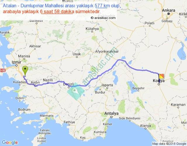 Atalan - Dumlupınar Mahallesi arası yaklaşık olarak 90 km/h ile yukarıda belirtilen sürede olup, iki yerin kuş uçuşu uzaklığı (mesafesi) 439'dir. Eğer belirtilen yerler arasında uçak seferi var ise bu süre uçakla 40 dakika'ya kadar düşebilir. Yolculuk otobüsle 9 saat 3 dakika sürmektedir.