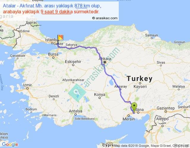 Atalar - Akfırat Mh. arası yaklaşık olarak 90 km/h ile yukarıda belirtilen sürede olup, iki yerin kuş uçuşu uzaklığı (mesafesi) 654'dir. Eğer belirtilen yerler arasında uçak seferi var ise bu süre uçakla 1 saat 00 dakika'ya kadar düşebilir. Yolculuk otobüsle 11 saat 53 dakika sürmektedir.