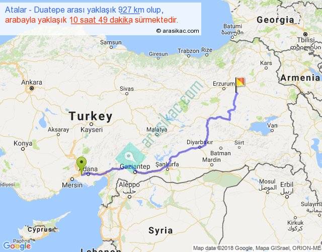 Atalar - Duatepe arası yaklaşık olarak 90 km/h ile yukarıda belirtilen sürede olup, iki yerin kuş uçuşu uzaklığı (mesafesi) 663'dir. Eğer belirtilen yerler arasında uçak seferi var ise bu süre uçakla 1 saat 01 dakika'ya kadar düşebilir. Yolculuk otobüsle 14 saat 3 dakika sürmektedir.