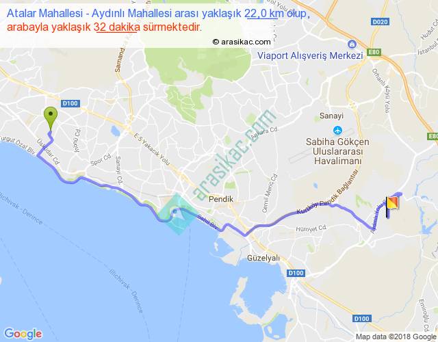 Atalar Mahallesi - Aydınlı Mahallesi arası yaklaşık olarak 90 km/h ile yukarıda belirtilen sürede olup, iki yerin kuş uçuşu uzaklığı (mesafesi) 15'dir. Yolculuk otobüsle 41 dakika sürmektedir.