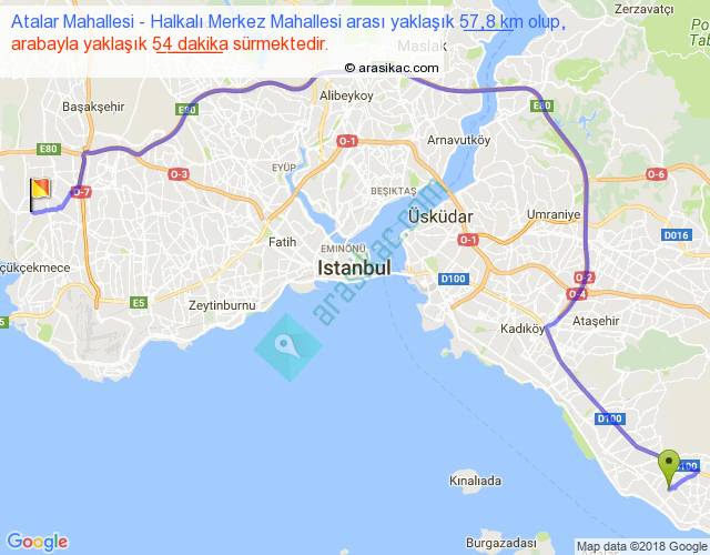 Atalar Mahallesi - Halkalı Merkez Mahallesi arası yaklaşık olarak 90 km/h ile yukarıda belirtilen sürede olup, iki yerin kuş uçuşu uzaklığı (mesafesi) 36'dir. Yolculuk otobüsle 1 saat 10 dakika sürmektedir.