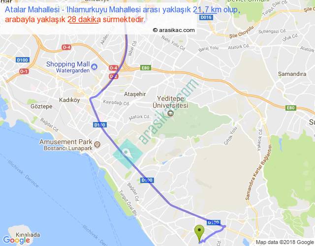 Atalar Mahallesi - Ihlamurkuyu Mahallesi arası yaklaşık olarak 90 km/h ile yukarıda belirtilen sürede olup, iki yerin kuş uçuşu uzaklığı (mesafesi) 13'dir. Yolculuk otobüsle 36 dakika sürmektedir.