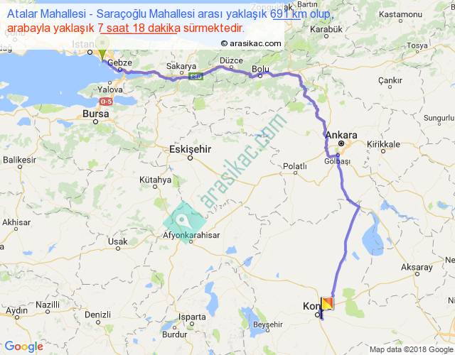 Atalar Mahallesi - Saraçoğlu Mahallesi arası yaklaşık olarak 90 km/h ile yukarıda belirtilen sürede olup, iki yerin kuş uçuşu uzaklığı (mesafesi) 448'dir. Eğer belirtilen yerler arasında uçak seferi var ise bu süre uçakla 41 dakika'ya kadar düşebilir. Yolculuk otobüsle 9 saat 29 dakika sürmektedir.
