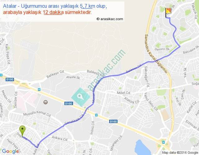 Atalar - Uğurmumcu arası yaklaşık olarak 90 km/h ile yukarıda belirtilen sürede olup, iki yerin kuş uçuşu uzaklığı (mesafesi) 4'dir. Yolculuk otobüsle 15 dakika sürmektedir.