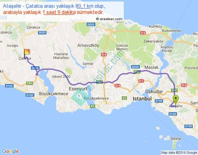Ataşehir - Çatalca arası yaklaşık olarak 90 km/h ile yukarıda belirtilen sürede olup, iki yerin kuş uçuşu uzaklığı (mesafesi) 59'dir. Yolculuk otobüsle 1 saat 29 dakika sürmektedir.