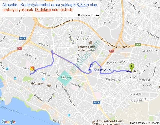 Ataşehir - Kadıköy İstanbul arası yaklaşık olarak 90 km/h ile yukarıda belirtilen sürede olup, iki yerin kuş uçuşu uzaklığı (mesafesi) 6'dir. Yolculuk otobüsle 23 dakika sürmektedir.