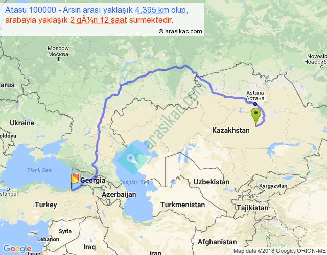 Atasu 100000 - Arsin arası yaklaşık olarak 90 km/h ile yukarıda belirtilen sürede olup, iki yerin kuş uçuşu uzaklığı (mesafesi) 2606'dir. Eğer belirtilen yerler arasında uçak seferi var ise bu süre uçakla 4 saat 00 dakika'ya kadar düşebilir. Yolculuk otobüsle 3 gün 6 saat sürmektedir.