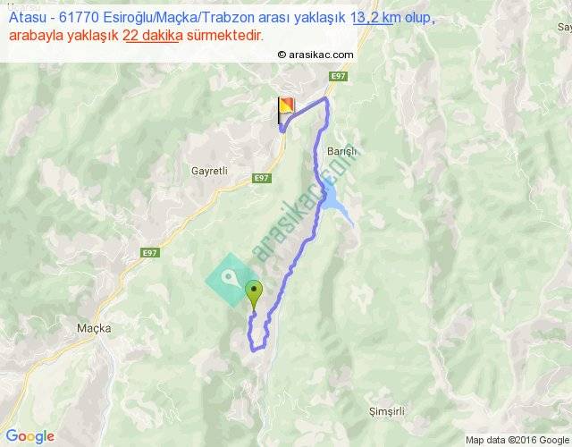 Atasu - 61770 Esiroğlu Maçka Trabzon arası yaklaşık olarak 90 km/h ile yukarıda belirtilen sürede olup, iki yerin kuş uçuşu uzaklığı (mesafesi) 6'dir. Yolculuk otobüsle 28 dakika sürmektedir.