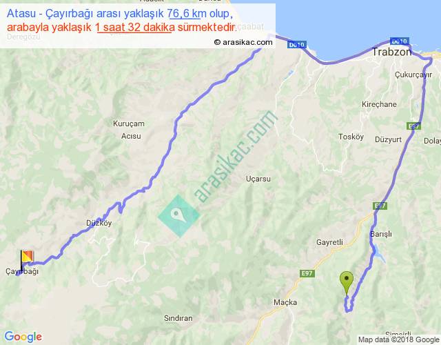 Atasu - Çayırbağı arası yaklaşık olarak 90 km/h ile yukarıda belirtilen sürede olup, iki yerin kuş uçuşu uzaklığı (mesafesi) 27'dir. Yolculuk otobüsle 1 saat 59 dakika sürmektedir.