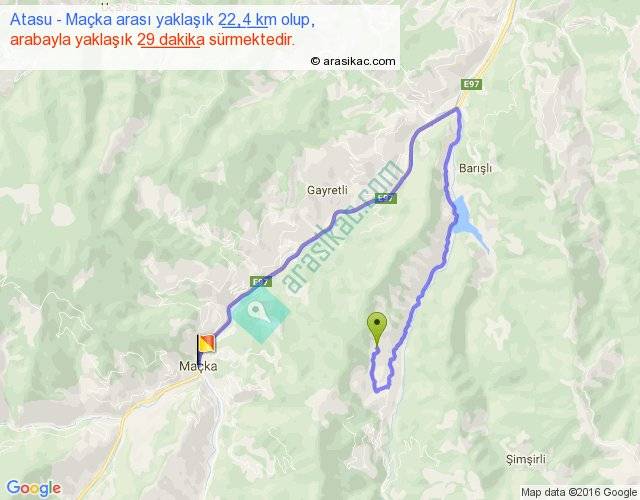 Atasu - Maçka arası yaklaşık olarak 90 km/h ile yukarıda belirtilen sürede olup, iki yerin kuş uçuşu uzaklığı (mesafesi) 5'dir. Yolculuk otobüsle 37 dakika sürmektedir.