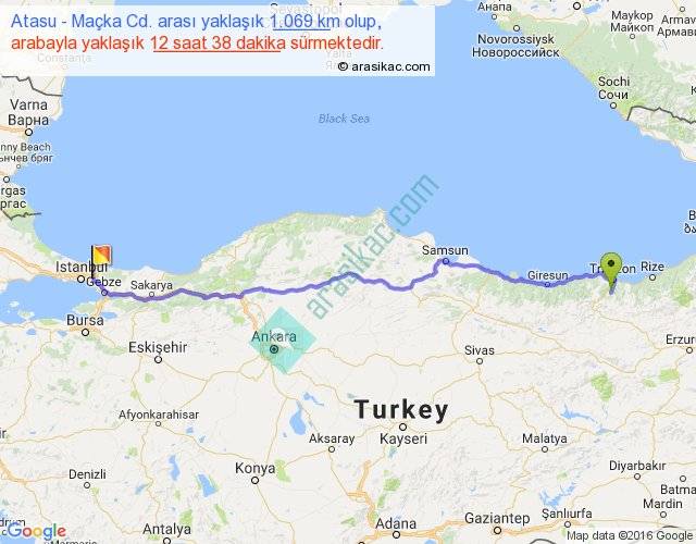 Atasu - Maçka Cd. arası yaklaşık olarak 90 km/h ile yukarıda belirtilen sürede olup, iki yerin kuş uçuşu uzaklığı (mesafesi) 873'dir. Eğer belirtilen yerler arasında uçak seferi var ise bu süre uçakla 1 saat 20 dakika'ya kadar düşebilir. Yolculuk otobüsle 16 saat 25 dakika sürmektedir.