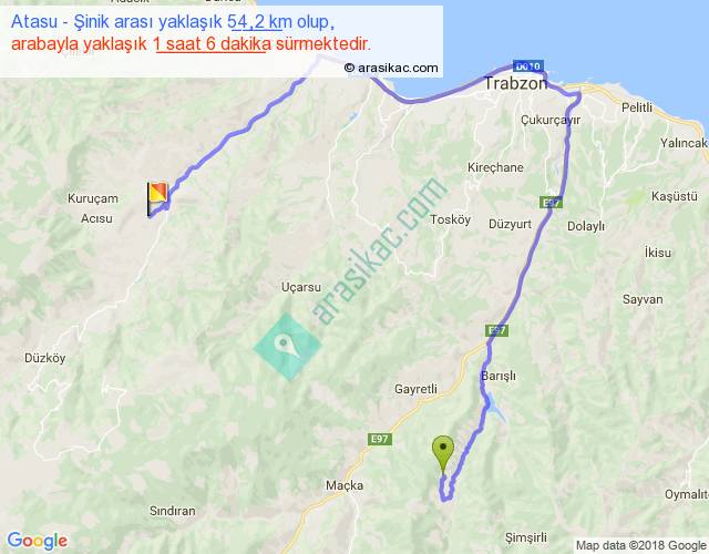 Atasu - Şinik arası yaklaşık olarak 90 km/h ile yukarıda belirtilen sürede olup, iki yerin kuş uçuşu uzaklığı (mesafesi) 20'dir. Yolculuk otobüsle 1 saat 25 dakika sürmektedir.