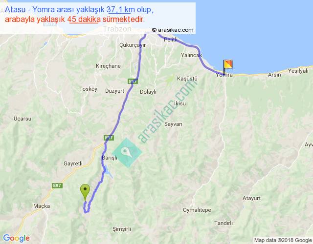 Atasu - Yomra arası yaklaşık olarak 90 km/h ile yukarıda belirtilen sürede olup, iki yerin kuş uçuşu uzaklığı (mesafesi) 22'dir. Yolculuk otobüsle 58 dakika sürmektedir.