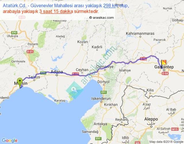 Atatürk Cd. - Güvenevler Mahallesi arası yaklaşık olarak 90 km/h ile yukarıda belirtilen sürede olup, iki yerin kuş uçuşu uzaklığı (mesafesi) 242'dir. Yolculuk otobüsle 4 saat 13 dakika sürmektedir.
