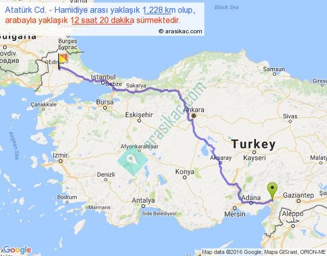 Atatürk Cd. - Hamidiye arası yaklaşık olarak 90 km/h ile yukarıda belirtilen sürede olup, iki yerin kuş uçuşu uzaklığı (mesafesi) 920'dir. Eğer belirtilen yerler arasında uçak seferi var ise bu süre uçakla 1 saat 24 dakika'ya kadar düşebilir. Yolculuk otobüsle 16 saat 2 dakika sürmektedir.