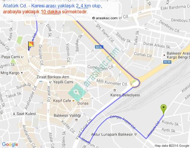 Atatürk Cd. - Karesi arası yaklaşık olarak 90 km/h ile yukarıda belirtilen sürede olup, iki yerin kuş uçuşu uzaklığı (mesafesi) 1'dir. Yolculuk otobüsle 13 dakika sürmektedir.