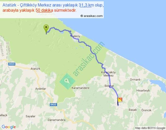 Atatürk - Çiftlikköy Merkez arası yaklaşık olarak 90 km/h ile yukarıda belirtilen sürede olup, iki yerin kuş uçuşu uzaklığı (mesafesi) 22'dir. Yolculuk otobüsle 1 saat 5 dakika sürmektedir.