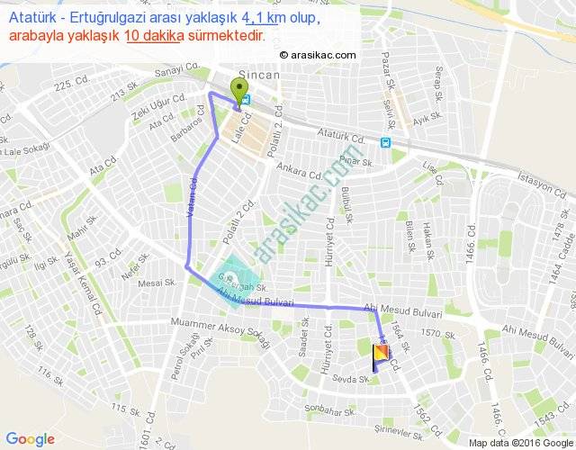 Atatürk - Ertuğrulgazi arası yaklaşık olarak 90 km/h ile yukarıda belirtilen sürede olup, iki yerin kuş uçuşu uzaklığı (mesafesi) 2'dir. Yolculuk otobüsle 13 dakika sürmektedir.