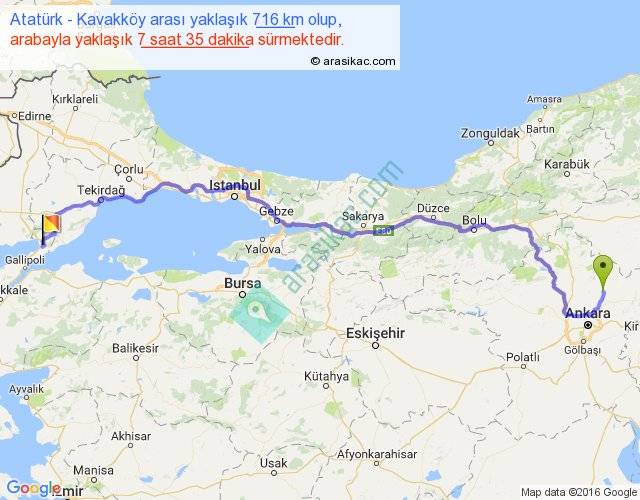 Atatürk - Kavakköy arası yaklaşık olarak 90 km/h ile yukarıda belirtilen sürede olup, iki yerin kuş uçuşu uzaklığı (mesafesi) 518'dir. Eğer belirtilen yerler arasında uçak seferi var ise bu süre uçakla 47 dakika'ya kadar düşebilir. Yolculuk otobüsle 9 saat 51 dakika sürmektedir.